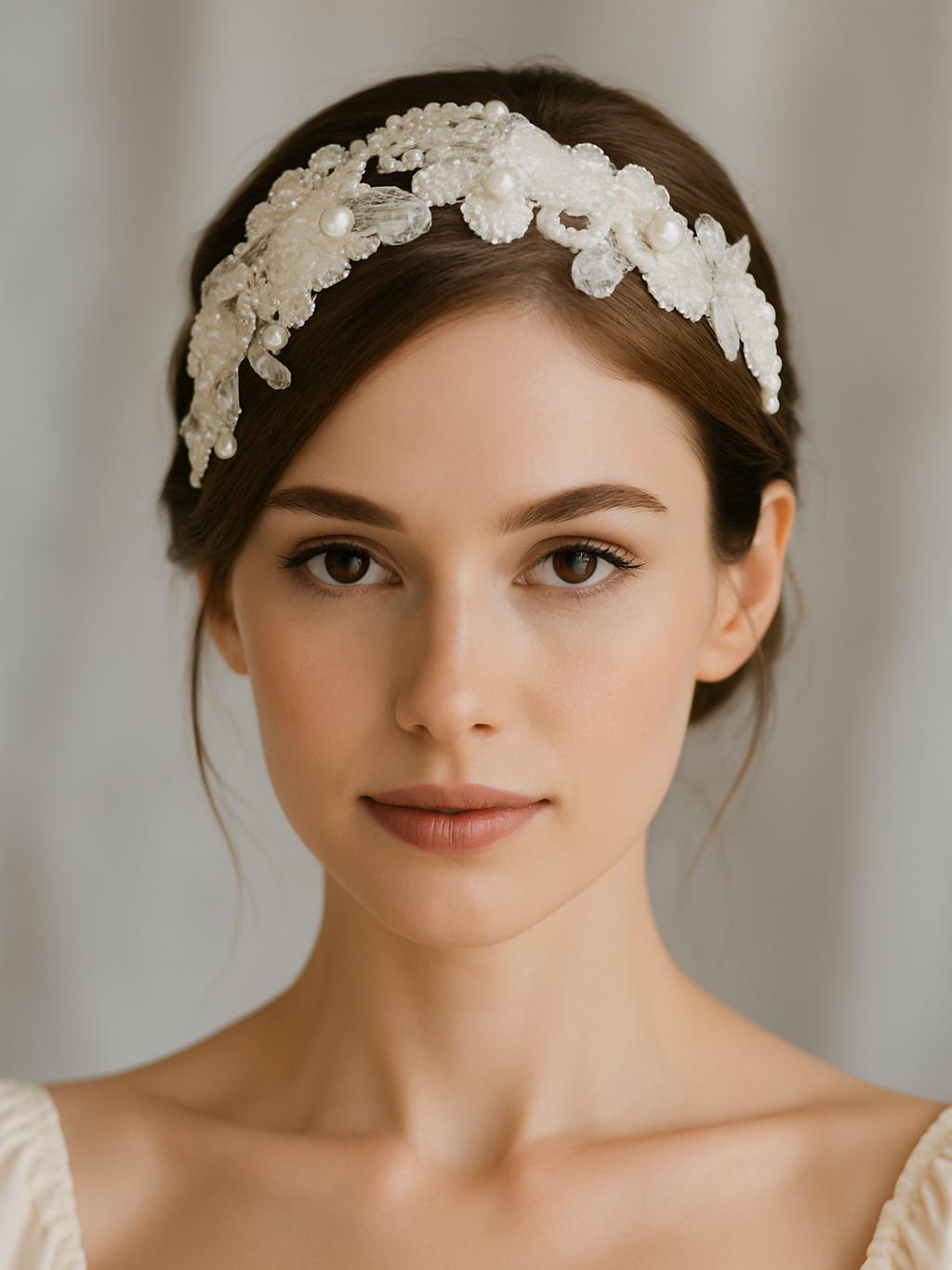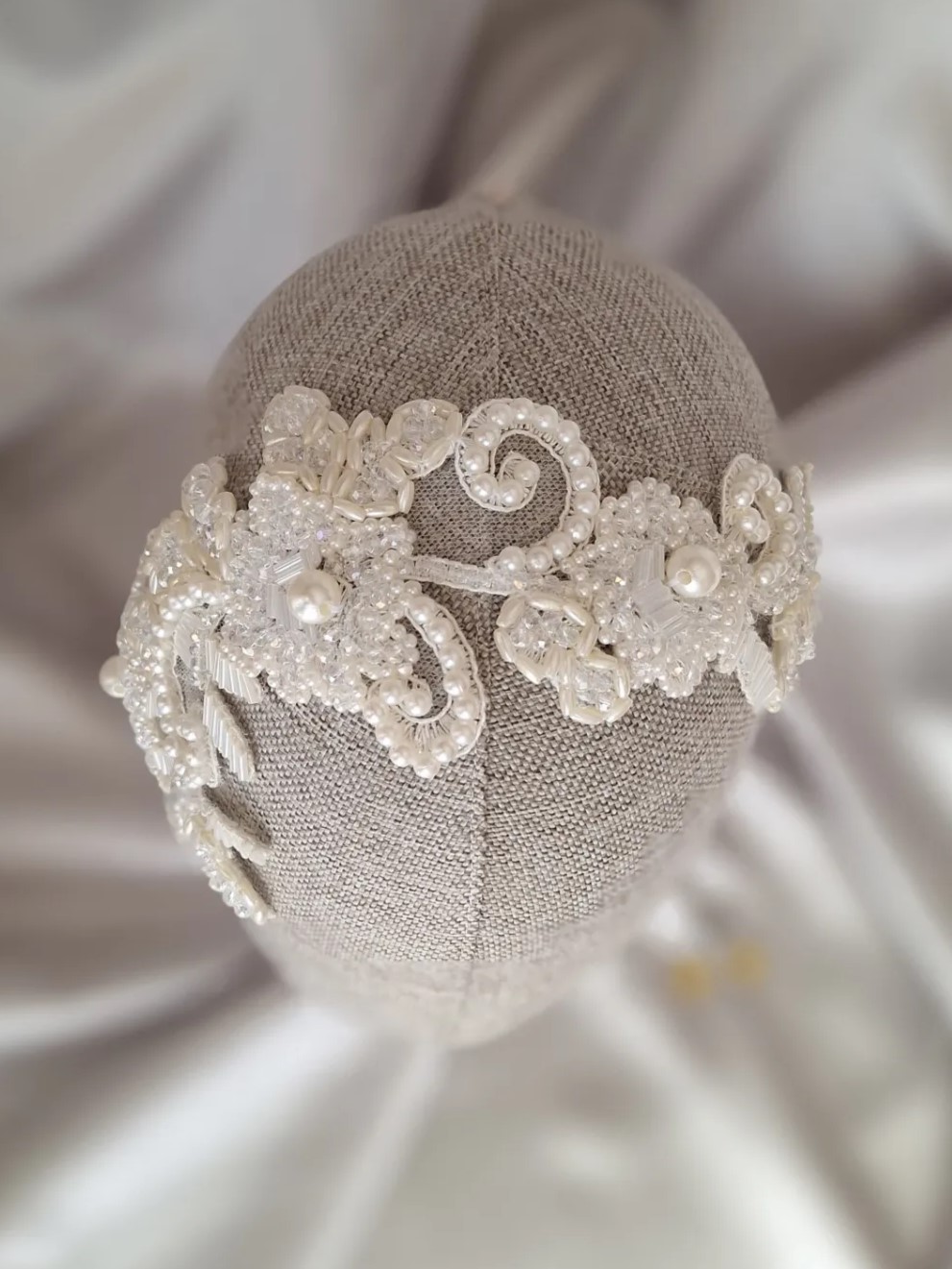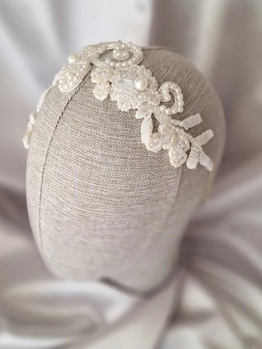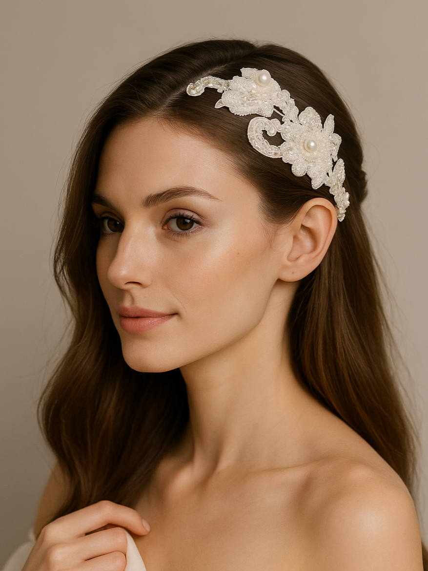 Kristal, inci ve boncuklarla işlenmiş dantel parıltısı! “Lace Glow”, vintage ruhunu modern zarafetle buluşturan, hem taç (ya da saç bandı) hem de yan toka olarak kullanılabilen çok yönlü bir aksesuardır.